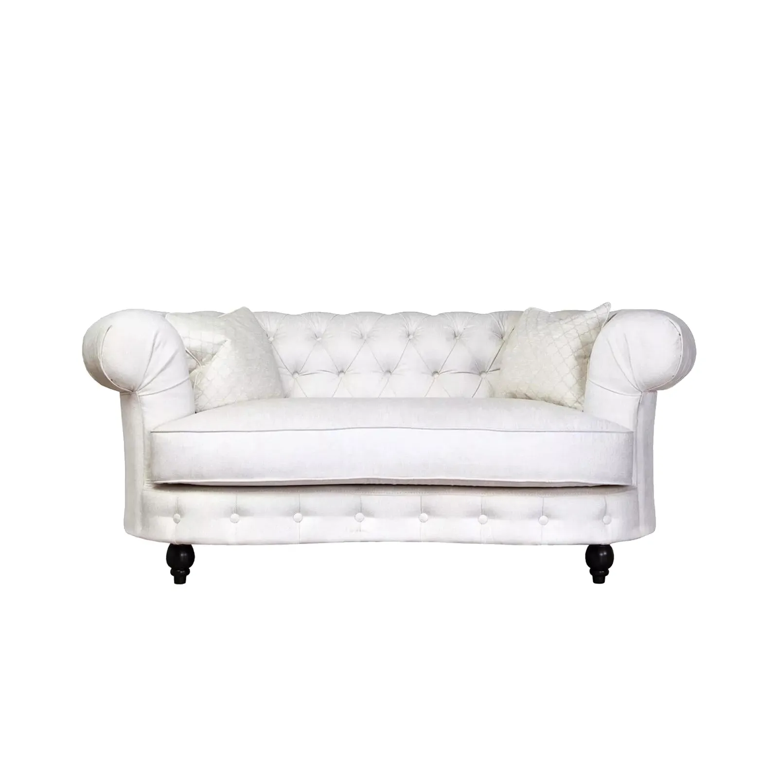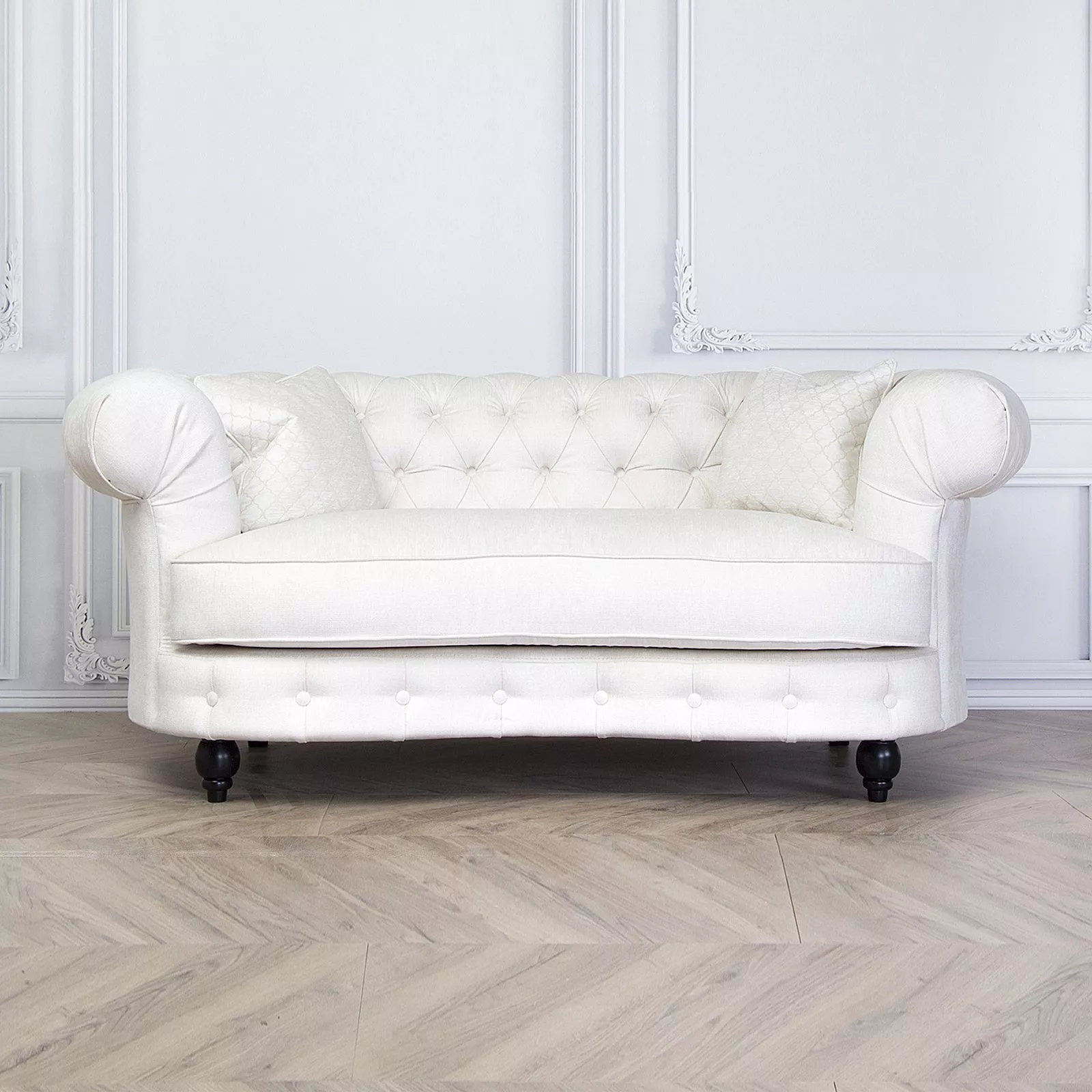 Романтичный компактный диван со сложными интересными формами.- подлокотники и спинка одной высоты, плавно переходящие друг в друга.- каретная стяжка ромбовидной формы.- декоративный кант по периметру дивана и подушек.- элегантная компактность позволяет ненавязчиво вписать эту модель во множество самых разных, даже скромных по площади пространств.- закругленные подлокотники, ткань на которых задрапирована красивыми крупными складками.- резные опоры, которые хорошо видны. Габариты (по самым выступающим элементам): 1800 х 950 х 770 мм. Диван является неразборным. Без механизма трансформации. Материалы: каркас – массив хвойных пород и фанера премиум-класса, подушки - гипоаллергенный искусственный лебяжий пух, опоры – массив бука, обивочная ткань – на выбор.