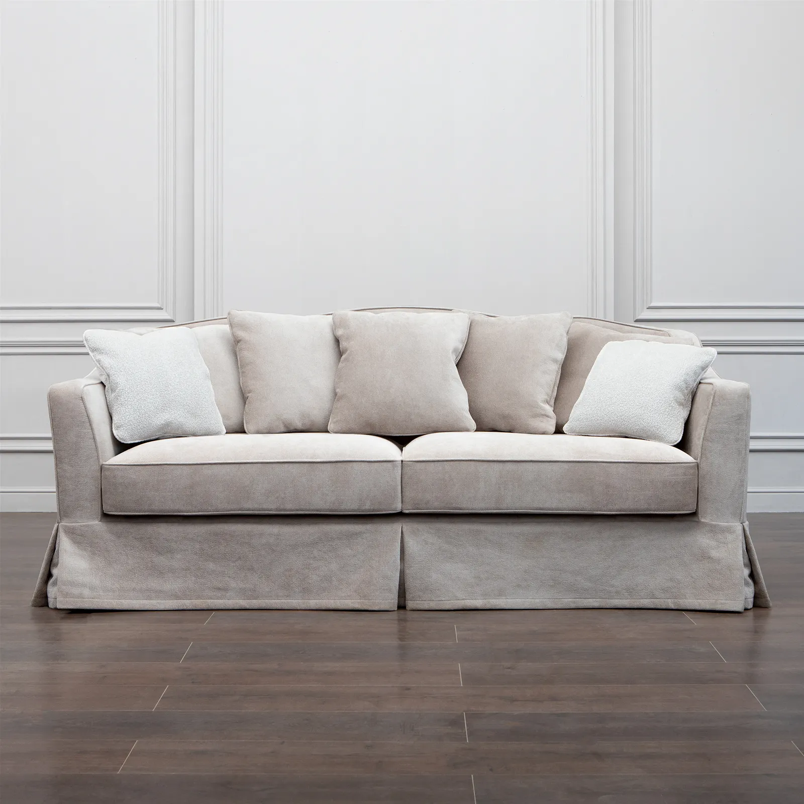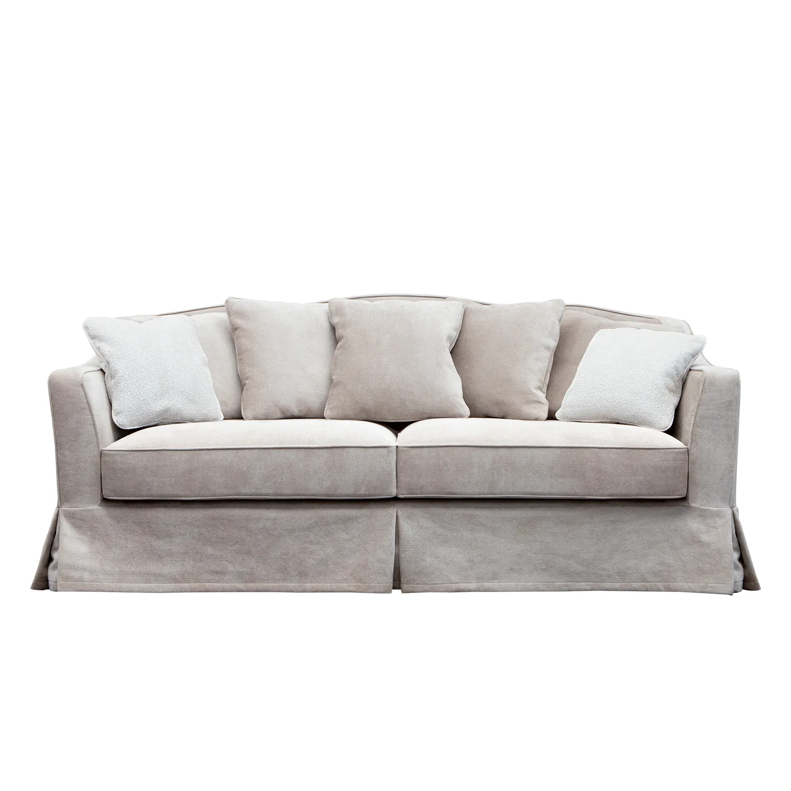 Романтичный диван с имитацией съемного чехла. - комфортная посадка и плавные линии подлокотников с площадками, повторяющие анатомию расслабленной руки.- элегантная простота и компактность позволяют ненавязчиво вписать эту модель во множество самых разных, даже скромных по площади пространств.- изящно изогнутые подлокотники плавной линией переходят в спинку.- изогнутая спинка дивана в тандеме с 5 декоративными подушками обеспечивает удобную зону посадки.- лаконичные формы, отсутствие какого-либо дополнительного украшения.- наличие канта в швах подлокотников и подушек.- особый шарм дивану придает "юбка", скрывающая опоры. Габариты (по самым выступающим элементам): 2130 х 950 х 930 мм. Возможно встроить механизм трансформации тройного сложения (гостевой вариант). Материалы: каркас – массив хвойных пород и фанера премиум-класса, подушки - гипоаллергенный искусственный лебяжий пух, опоры – массив бука, обивочная ткань – на выбор.