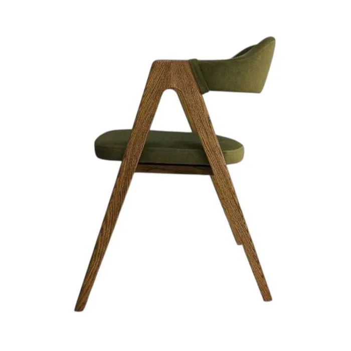 Лаконичное кресло с обнимающей спинкой и компактными подлокотниками. Каркас из массива дуба подчёркивает текстуру древесины, мягкая зелёная обивка даёт уютный акцент в интерьере. Подойдёт для столовой, гостиной, кабинета или кафе. Ключевые особенности Материал каркаса: массив дуба Обивка: износостойкая мебельная ткань, цвет — нежный зелёный Посадка: средне-мягкая, поддерживающая спина Конструкция: полукруглая «barrel»-спинка, компактные подлокотники, устойчивые ножки Стиль: сканди/ mid‑century, минимализм Применение: обеденная зона, рабочее место, переговорная, кафе/ресторан