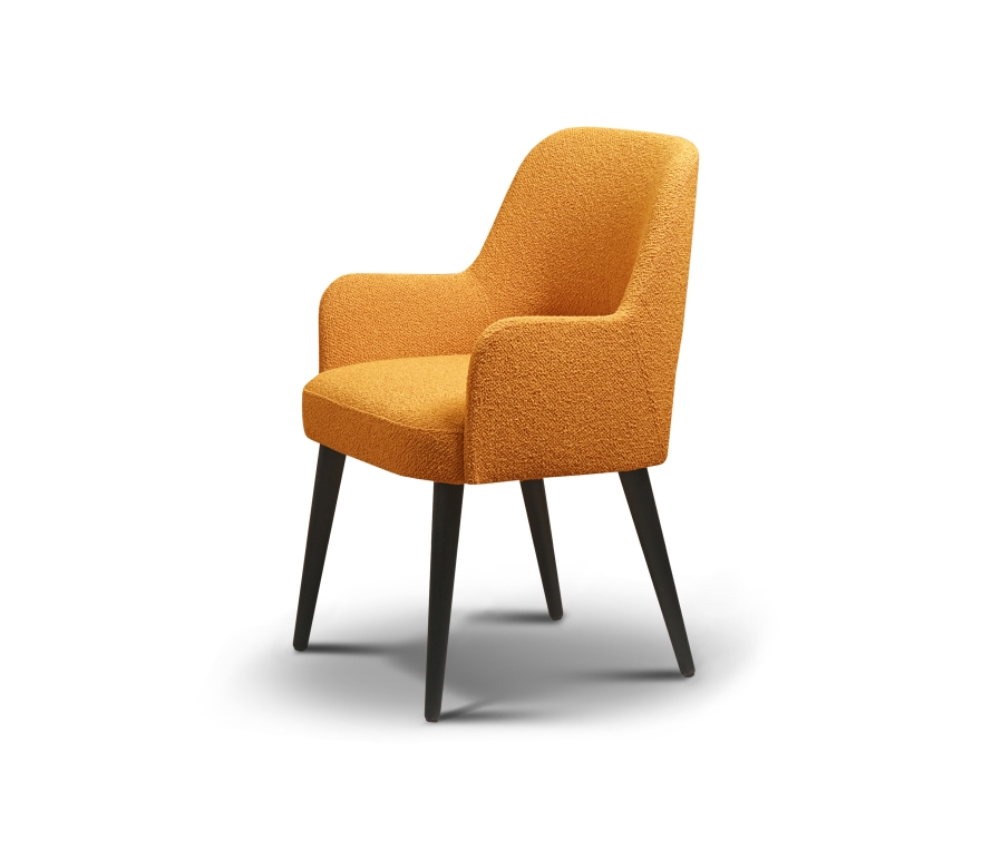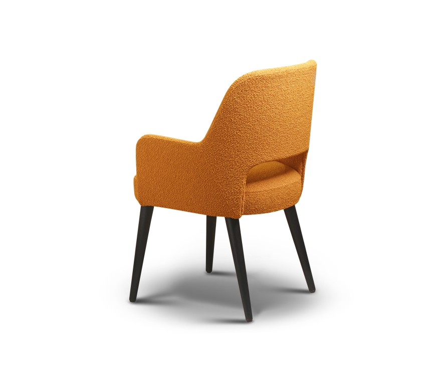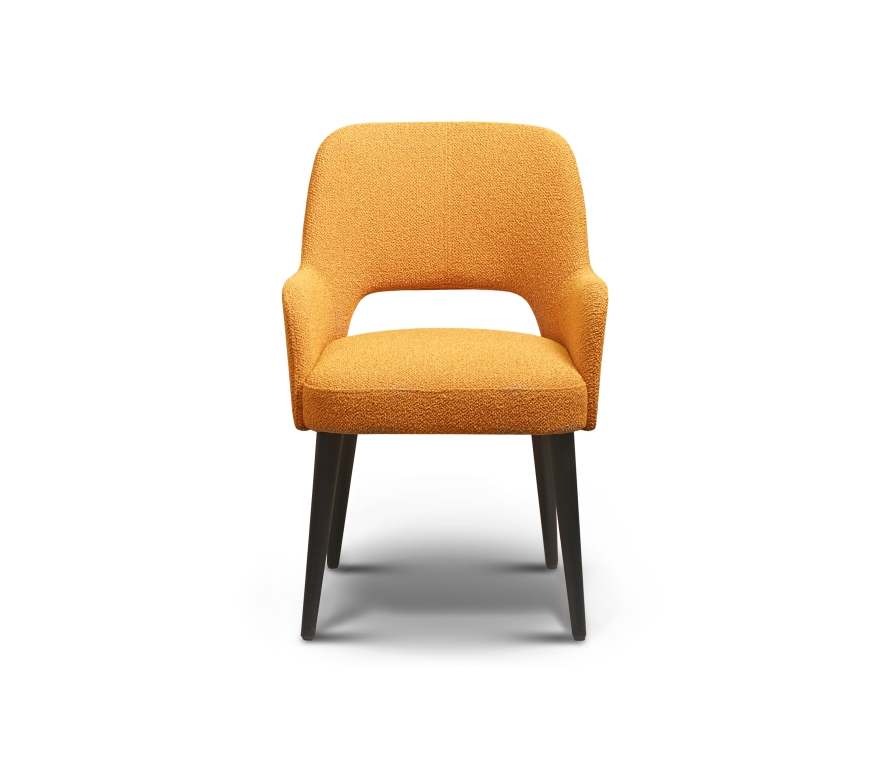 Очень компактная модель отлично подойдет для домов и квартир где важен каждый сантиметр. При этом эргономика просчитана таким образом чтобы компактный размер не ограничивал возможности использования модели. Элегантный вырез в спинке облегчает форму. Такое решение стало очень модно за последние годы и стулья с таким элементом часто используют дизайнеры в интерьерах. Ножки в стиле 60-х отлично дополняют этот дизайн. Возможны любые варианты отделки и обивки.