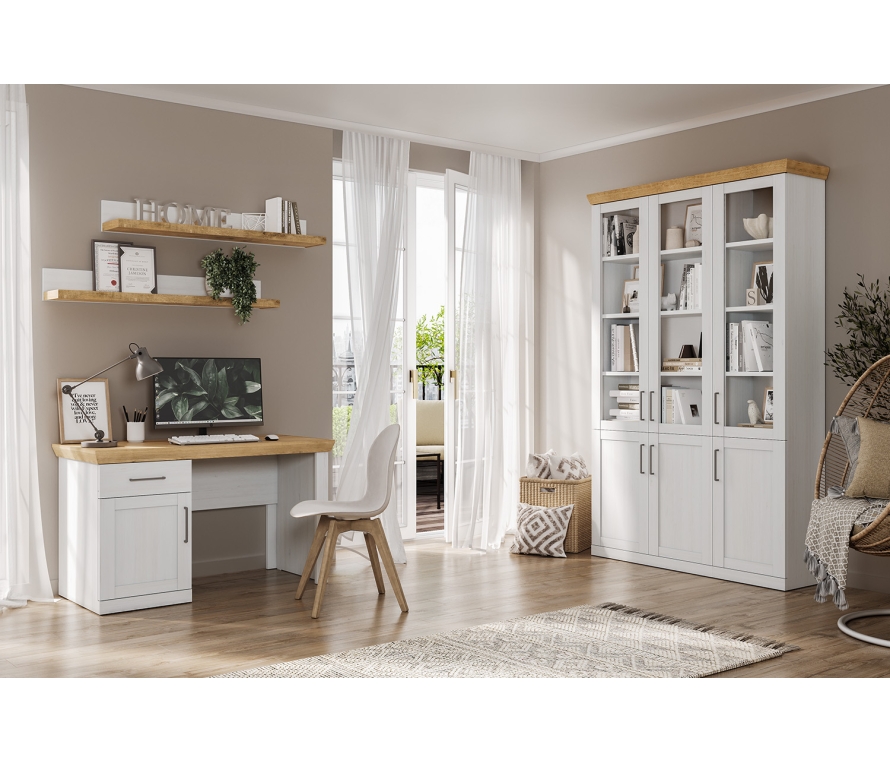 Состав:Шкаф для книг Магнум МГ-204.23 - 1 шт;Шкаф для книг Магнум МГ-214.23 - 1 шт;Верхняя крышка для шкафов Магнум МГ-015.03 - 1 шт;Стол письменный Магнум МГ-530.02 (правый) - 1 шт;Полка Магнум МГ-024.02 - 2 шт.Особенности:Коллекция универсальна и подойдет интерьерам в стилях лофт, скандинавский, фьюжн, эко;Мебель из коллекции Магнум легко подстроится под уже имеющийся интерьер или может стать основой для нового.Характеристики:Мебель выполнена в цвете «блан шене», верхние крышки шкафов и стола — в цвете «дуб бунратти»;Декоративные металлические ручки сделаны в цвете «железо античное черное»;На столешнице стола по периметру декоративный профиль. На задней стороне стола — фальшпанель с декоративными профилями (повторяющими внешний вид рамочных фасадов);Двери шкафов могут быть перевешены на правую боковую стенку;Максимальная распределенная нагрузка на одну полку шкафа — 4-6 кг;Мебель необходимо крепить к стене во избежание опрокидывания.Материалы:Корпус стола и стеллажей: ламинированная плита ДСП толщиной 1,6 и 2,2 см класса эмиссии Е1;Для кабинета используется крепежная фурнитура и механизмы ведущих производителей;В выдвижных ящиках стола используются направляющие скрытого монтажа со встроенным доводчиком. Это позволяет легко и почти бесшумно выдвигать-задвигать ящики, а также обеспечивает надежную фиксацию ящика и гарантирует длительный срок службы даже при высокой нагрузке.