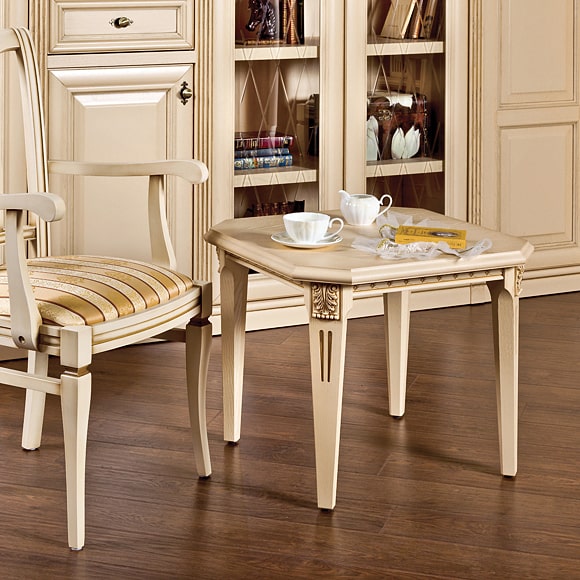 Столик журнальный из коллекции модульной мебели для дома LaScala. Изготовлен с использованием массива и шпона натурального дерева. Ножки стола и низ столешницы декорированы резными элементами из массива.