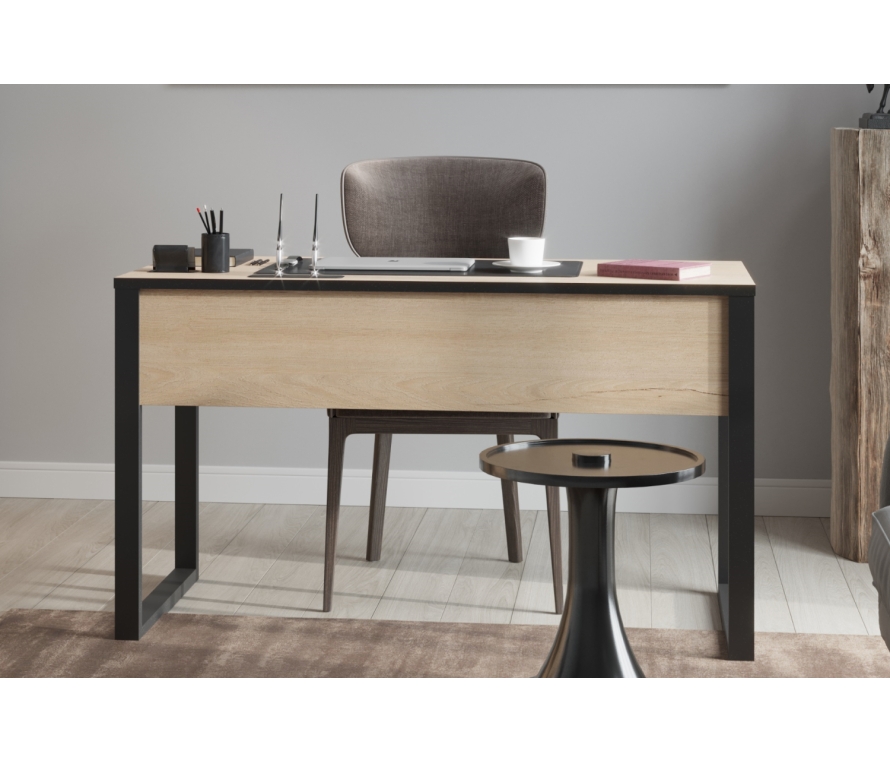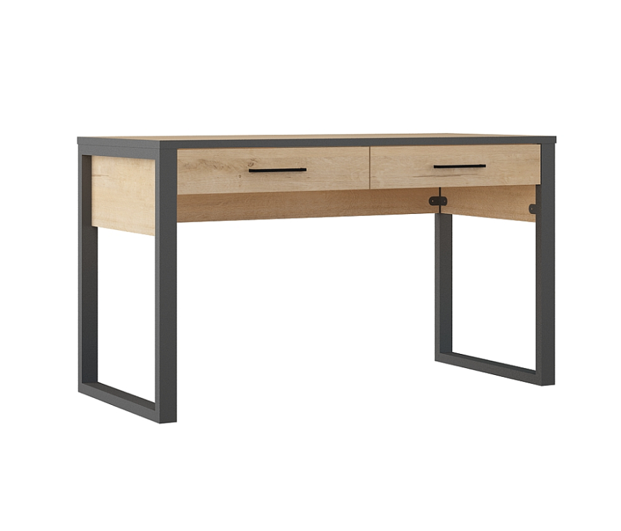 Характеристики:Стол письменный с двумя выдвижными ящиками;Цвет: дуб бунратти, черный;Цвет ручек: железо античное черное;В выдвижной ящик можно класть не более 5-7 кг, при этом нагрузка должна быть распределена по всему дну (не класть тяжелые предметы, которые могут повредить и выдавить дно);Необходимо использовать изделие по назначению — не садиться на крышку стола, не подвергать длительным динамическим нагрузкам.Материалы:Стол сделан из ламинированной плиты ДСП класса эмиссии Е1;Для облицовывания кромок деталей используется высококачественный материал от ключевых производителей;Основание-каркас: металл, окрашен эмалью;Ручки: металл;В выдвижных ящиках используются направляющие скрытого монтажа со встроенным доводчиком. Это позволяет легко и почти бесшумно выдвигать-задвигать ящики, а также обеспечивает надежную фиксацию ящика и гарантирует длительный срок службы даже при высокой нагрузке.