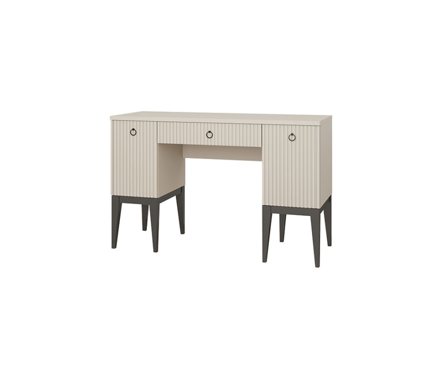Характеристики:Цвет: кашемир серый;Цвет ручек: чёрный матовый;Стол можно заказать в цвете белый премиум.Материалы:Каркас: ЛДСП 1,6 см, крышка 2,2 см;Фасады ящиков: МДФ с декоративной фрезеровкой в виде вертикальных полос и окутаны плёнкой ПВХ;Ручки: металл, тип «серьга»;Стол установлен на нерегулируемых по высоте буковых опорах, отделка — серая матовая эмаль;Ящики на выдвижных механизмах скрытого монтажа;Установлены доводчики.