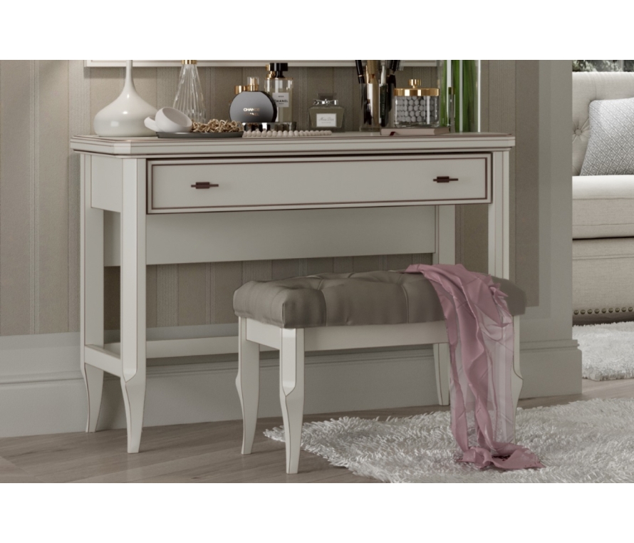 Характеристики:Стол туалетный с одним выдвижным ящиком;Цвет: серо-белый;В выдвижной ящик можно класть не более 5-7 кг, при этом нагрузка должна быть распределена равномерно по всему дну (не класть тяжелые предметы, которые могут повредить и выдавить дно);На верхнюю крышку стола нельзя устанавливать тяжелые предметы;Стол необходимо крепить к стене во избежание опрокидывания.Материалы:Корпус: ЛДСП;Фасад ящика рамочный;Для облицовывания кромок деталей используется высококачественный материал производства Германии, Австрии;Крепежная фурнитура ведущего производителя Hettich (Германия);Для выдвижного ящика используется система скрытых направляющих Quadro со встроенным демпфером (Германия, Hettich).