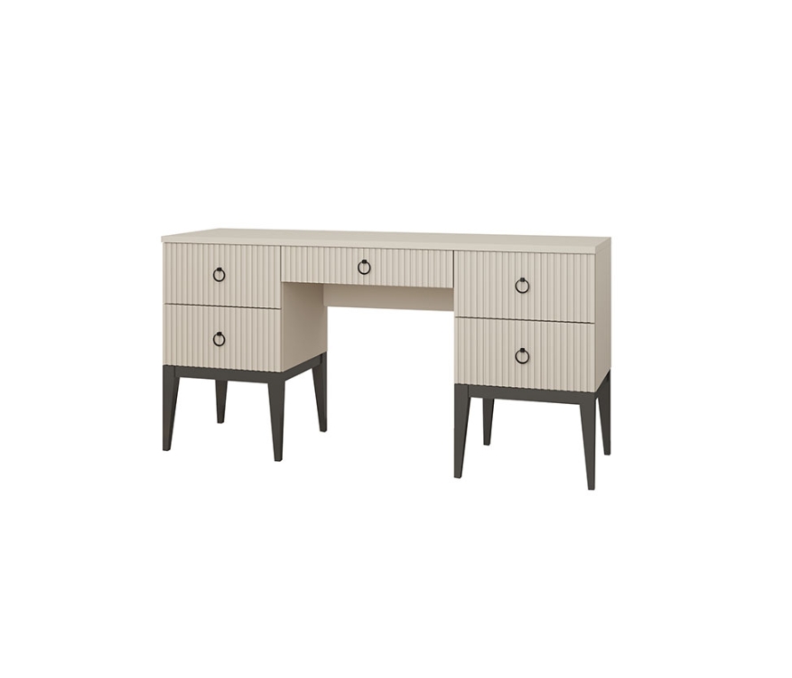 Характеристики:Цвет: кашемир серый;Цвет ручек: чёрный матовый;Стол можно заказать в цвете белый премиум.Материалы:Каркас: ЛДСП 1,6 см, крышка 2,2 см;Фасады ящиков: МДФ с декоративной фрезеровкой в виде вертикальных полос и окутаны плёнкой ПВХ;Ручки: металл, тип «серьга»;Стол установлен на нерегулируемых по высоте буковых опорах, отделка — серая матовая эмаль;Ящики на выдвижных механизмах скрытого монтажа;Установлены доводчики.