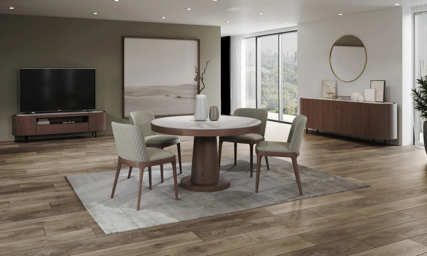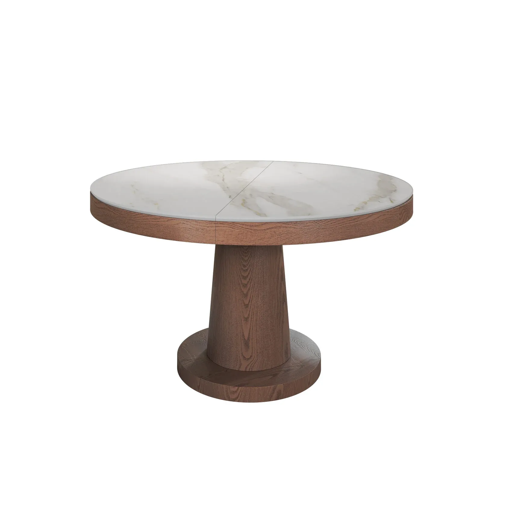 Стол с круглой столешницей, раскладывающийся от 1100 до 1500 мм, представляет собой элегантное и удобное решение для обеденной зоны. Столешница выполнена из матовой керамики толщиной 6 мм, что придает ей стильный и современный вид. Благодаря возможности раскладывания, этот стол идеально подойдет как для небольших, так и для просторных помещений, позволяя удобно разместить большее количество гостей. Опора стола выполнена из МДФ с натуральным шпоном, что придает конструкции прочность и устойчивость. Кроме того, комбинация материалов добавляет столу изысканный и элегантный вид. Этот стол сочетает в себе функциональность, качество материалов и стильный дизайн, что делает его идеальным выбором для обеденной зоны вашего дома или кафе. Он станет уютным и привлекательным акцентом в любом интерьере. Стол с круглой столешницей раскладывающийся, с матовой керамикой 6мм. Опора: МДФ шпон.