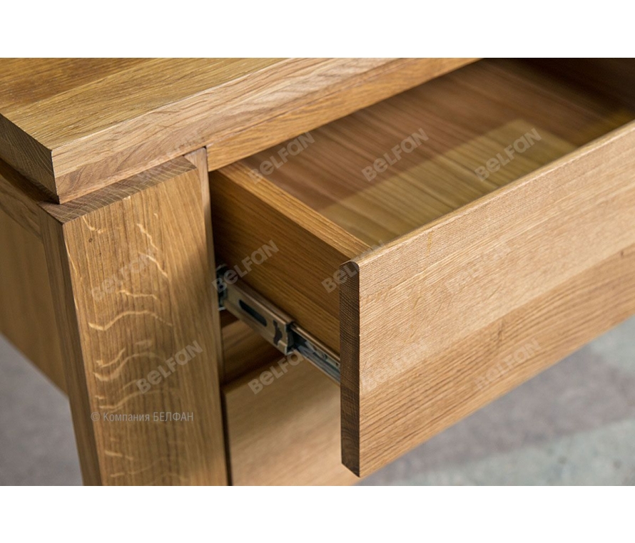 Письменный стол Bergen прекрасно впишется, как в домашний кабинет, так и в детскую или комнату подростка. Особенности стола письменного «Берген» (Bergen) В: ? Два выдвижных ящика для хранения документов, письменных принадлежностей или учебных пособий. ? Качественные шариковые направляющие полного выдвижения (европейского пр-ва) – для плавного открывания и доступа ко всему объёму ящика. ? Удобный размер – оптимальное соотношение длины и глубины стола позволит разместить на рабочей поверхности все необходимые для учёбы и работы предметы. Пространства под столом достаточно для комфортного размещения на кресле или на стуле. ? Экологичная отделка: натуральный дуб пропитан только бейц-маслом (европейского пр-ва), которое наносится вручную. На поверхности образуется защитная гидрофобная пленка, благодаря которой покрытие впитывается в структуру дерева, но не оставляет следов на одежде или предметах, которые контактируют с поверхностью. ? Изделие выполнено из массива и натурального шпона дуба. Мебель из массива дерева необыкновенно красива, добротна и славится своим долголетием. Однако, чтобы продлить этот срок, сохранить мебельным изделиям первоначальную элегантность и отличный внешний вид, за ней необходим надлежащий уход. Если у вас появились царапины, следы от кружки или мокрой тряпки, то сервис-бокс от компании BELFAN поможет вам вернуть мебели первозданный вид даже в домашних условиях. Данный сервис-бокс подходит только для мебели в крашении бейц-масло. Примерьте письменный стол «Берген» у себя дома! Пройдите по ссылке. Схема стола: