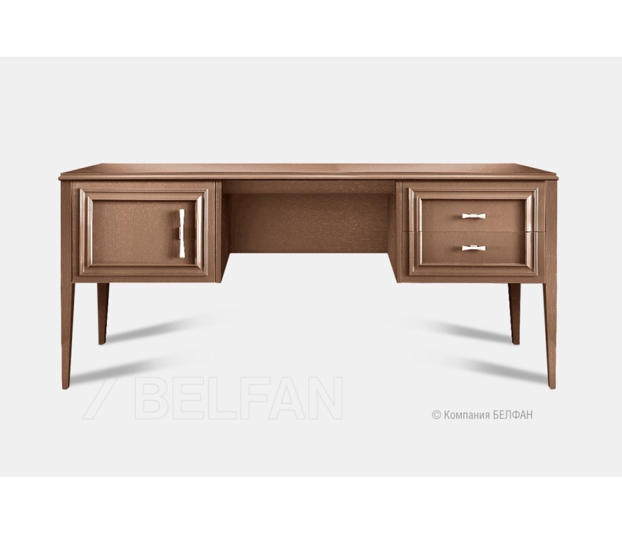 Коллекция «Сакраменто» создана для тех, кто ценит современный дизайн в классических формах. Эта мебель с характером: четкие линии, глубокие оттенки, выразительная фурнитура. Высокие ножки создают ощущение легкости, а гармоничное сочетание цветов и фактур наполняет интерьер атмосферой уюта и стиля. Стол письменный «Сакраменто» (2 тумбы) выполнен в двух вариантах отделки: утонченный «марципан» или элегантный «сумеречный». Корпус из шпона дуба и МДФ подчеркивает природную текстуру дерева, а глубокие рамочные фасады с выразительной фрезеровкой и изысканными ручками создают ощущение респектабельности. Высокие зауженные ножки придают конструкции легкость, сохраняя при этом надежную устойчивость. Функциональные особенности ? Размеры: ширина 1750 мм, высота 760 мм, глубина 600 мм. ? Правая тумба содержит два глубоких выдвижных ящика с плавным ходом — идеально для канцелярии, документов и личных вещей. ? Левая тумба оснащена просторной дверцей для габаритных предметов. ? Центральное пространство стола шириной 650 мм обеспечивает удобное размещение кресла и комфорт при работе за компьютером или с бумагами. ? Глубина столешницы 600 мм позволяет разместить монитор, лампу, органайзеры и при этом оставить достаточно места для письма или чтения. ? Задняя стенка стола выполнена из МДФ, который покрыт лакокрасочным материалом, что позволит использовать данный стол для зонирования пространства в интерьере. ? Два варианта крашения: марципан и сумеречный позволяют подобрать решение под любое стилевое решение комнаты. Экологичность и материалы ? Ножки и багетные рамы на фасадах изготовлены из массива дуба. ? Фасады, столешница, боковые стенки изготовлены из шпонированного дубом МДФ класса безопасности Е1. ? В покрытии изделия используются краски на водной основе, что свидетельствует о безопасности и соответствует высоким стандартам качества. В интерьере Этот стол станет эффектным акцентом как в классическом кабинете, так и в современном рабочем пространстве. Отделка в цвете «марципан» наполнит комнату светом и создаст ощущение простора, а «сумеречный» оттенок добавит глубины и подчеркнет солидность интерьера. Рекомендации по сочетанию ? Для домашнего кабинета или гостиной — сочетайте со стеллажами и витринами коллекции «Сакраменто» в том же тоне. ? В современном интерьере подчеркните его контрастом — используйте текстиль и аксессуары в насыщенных, теплых оттенках. ? В классическом пространстве гармонично смотрится с мебелью из массива и мягкими креслами с высокими спинками Примерьте письменный стол «Сакраменто» у себя дома! Пройдите по ссылке. Схема стола: