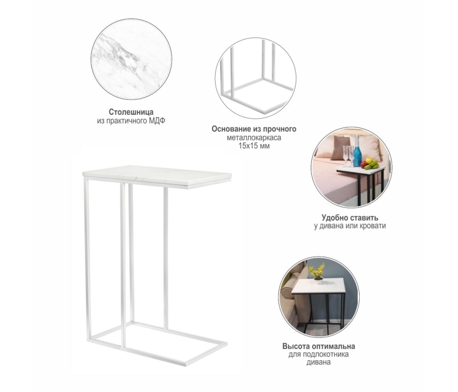 Придиванный столик Loft станет настоящим дополнением к интерьеру в современном стиле. Столик не займет много места и легко поместится рядом с диваном или креслом. Конструкция столика позволяет расположить столешницу прямо над диваном или боковиной дивана, что достаточно удобно и функционально. Столик выполнен из прочного ЛДСП оттенка белый мрамор, что придает ему изящный вид, а белые металлические ножки добавляют конструкции дополнительную изящность и устойчивость. Будьте уверены, что столик Loft станет удачным приобретением для вашего уютного уголка.