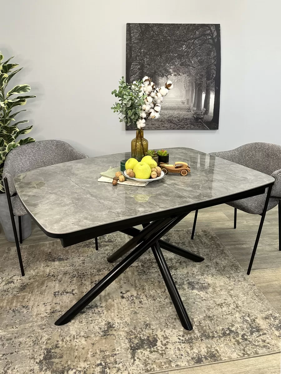 Стол с глянцевой керамикой и очень удобной центральной опорой, которая развернута таким образом, чтобы без помех ставить рядом 2 широких стула. Опора не мешает сидеть, а полностью скругленная столешница делает стол безопасным.