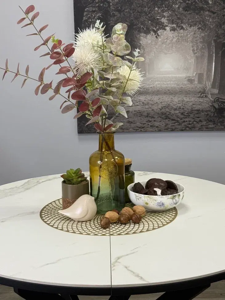 Ключевой особенностью этого стола является керамическая поверхность диаметром 90 см и долговечным, стабильным основанием. Дополняет комплект вставка на 30 см, расширяющая площадь стола. Основные преимущества Стол сконструирован так, чтобы идеально подходить семье из трех-четырех человек. Керамическая столешница устойчива к воздействию различных домашних неприятностей. Благодаря керамической вставке есть возможность увеличивать размер стола при необходимости. Столешница премиум-класса Керамическая продукция толщиной 5,6 мм отличается высокой стойкостью к царапинам, способна выдержать экстремально высокие температуры, обладает водоотталкивающими свойствами и устойчивостью к воздействию бытовой химии, а также сохраняет свой первоначальный цвет на протяжении всего срока эксплуатации. Высокая надежность материалов Центральное основание спроектировано так, чтобы не создавать помех при посадке. Столешница надежно закреплена и обеспечивает стабильность конструкции.