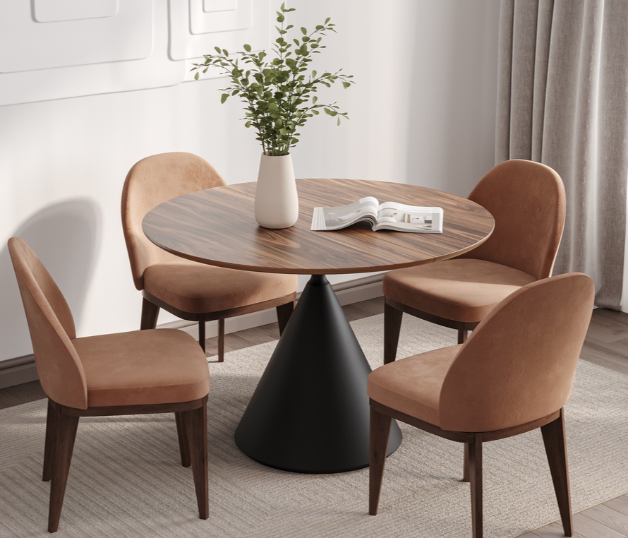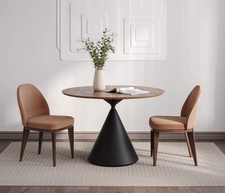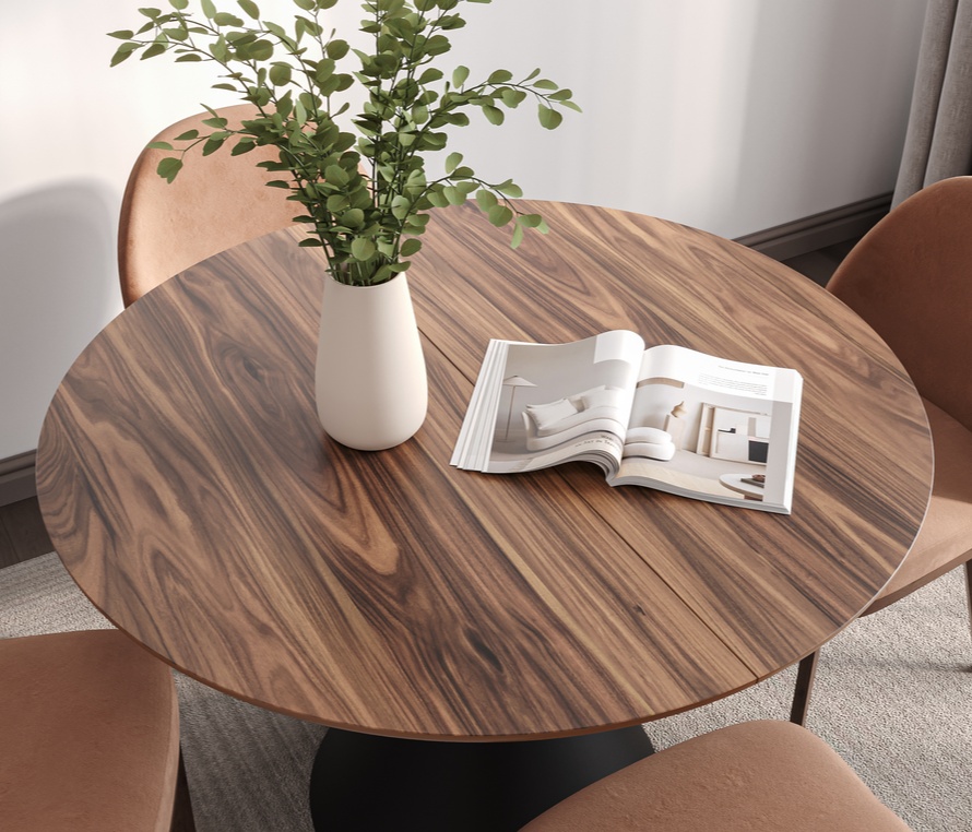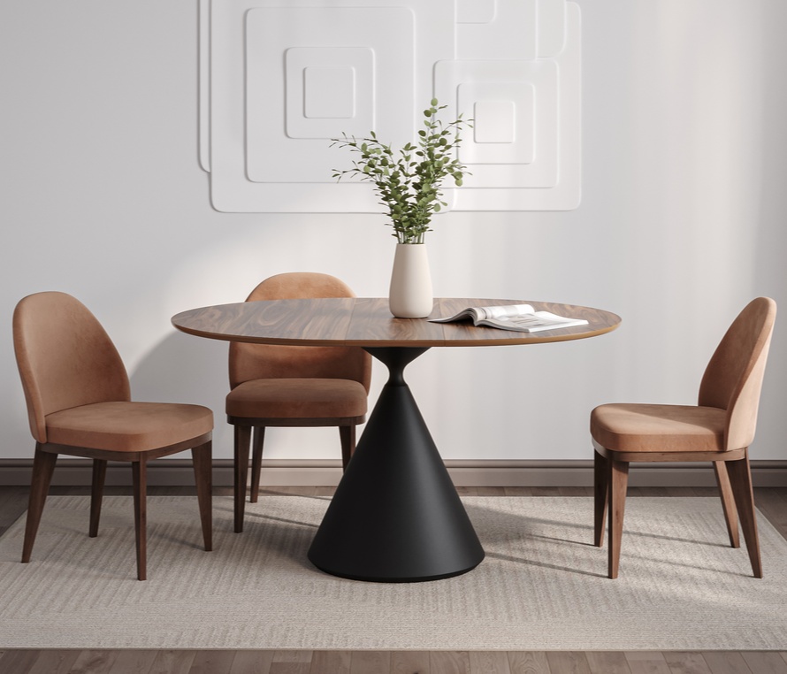 Круглый обеденный стол Eco X-Steel от фабрики Napilili сочетает стильный, лаконичный и одновременно брутальный дизайн с удобством и стабильностью. Столешница выполнена из шпона американского ореха, а металлическое подстолье в форме песочных часов придаёт изделию современный и выразительный вид. Стол может быть как раздвижным, так и стационарным. Ножки имеют X-образную форму и изготовлены из стали с порошковым покрытием цвета по шкале RAL.