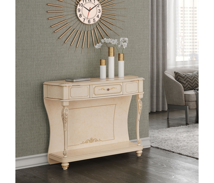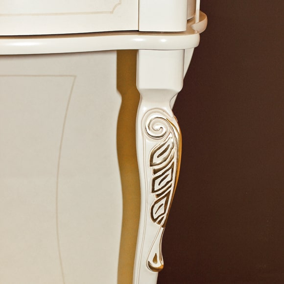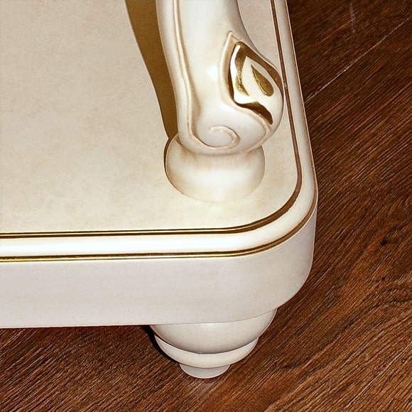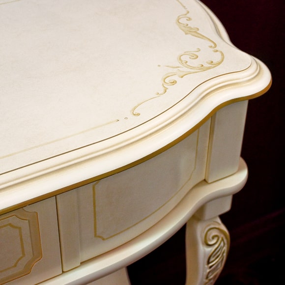 Стол консольный декорирован художественной ручной росписью с позолотой. Донья выдвижных ящиков драпированы красивой тканью. Габаритный размер указан по максимально выступающим частям изделия. Цена указана без учета стоимости зеркала.
