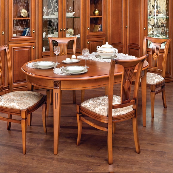 Стол обеденный овальный раскладной, изготовлен с использованием массива и шпона натурального дерева. Ножки стола декорированы резными элементами из массива.