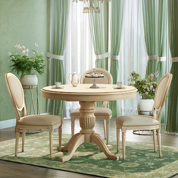 Стол раздвижной обеденный с круглой крышкой. Выпускается в двух типоразмерах. С его помощью можно обустроить полноценную обеденную зону даже в небольшой по размеру кухне или гостиной.
