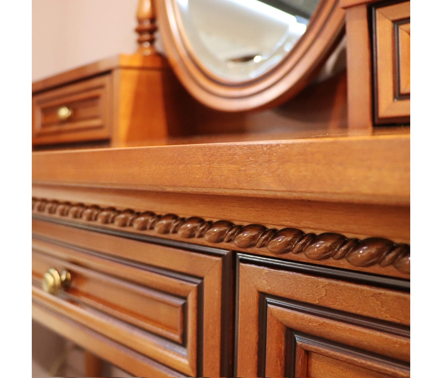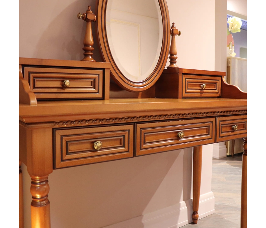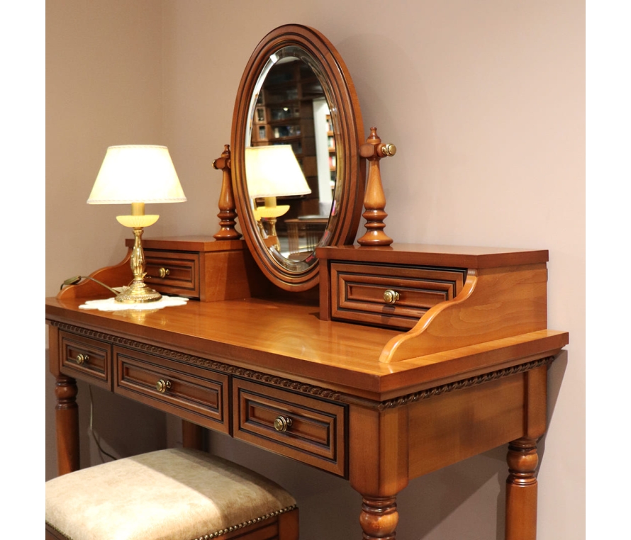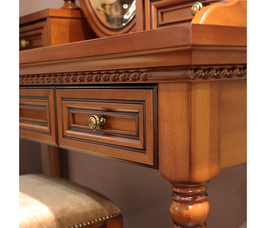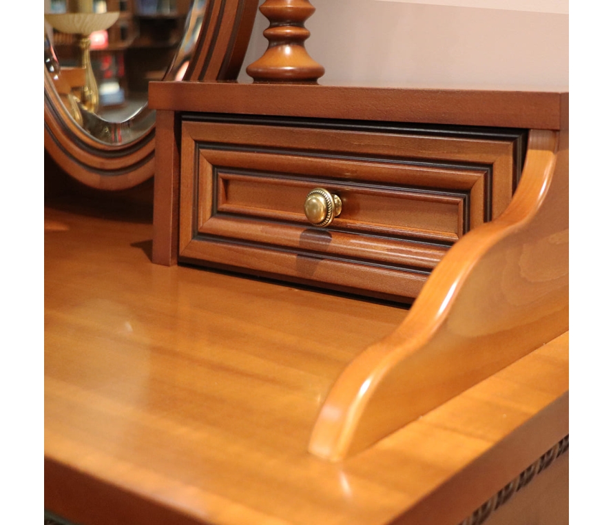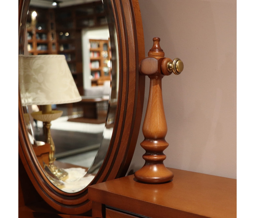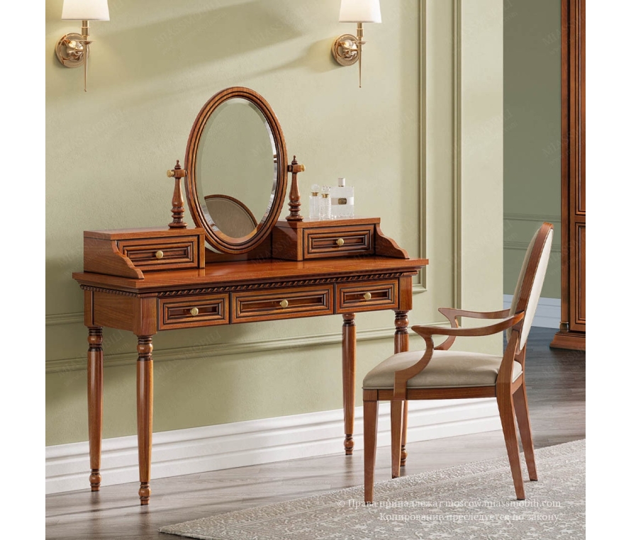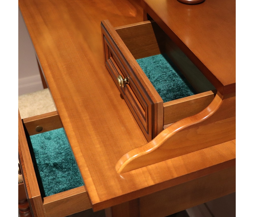 Ножки туалетного столика, столешница, накладные профили передних стенок ящиков выполнены из массива бука и облицованы шпоном красного дерева. Столик имеет пять небольших удобных ящичков, в которых можно разместить украшения и косметику. Внутри ящички драпированы зеленым бархатом. В верхней части столика установлено изящное овальное зеркало.
