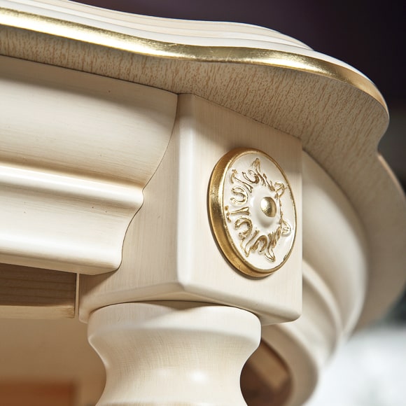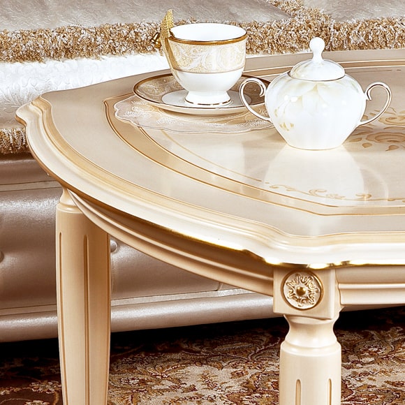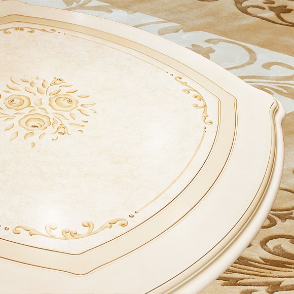 Столешница журнального столика декорирована ручной художественной росписью. Основание и резные ножки выполнены из массива. В отделке используется сусальное золото.Габаритный размер указан по максимально выступающим частям изделия.