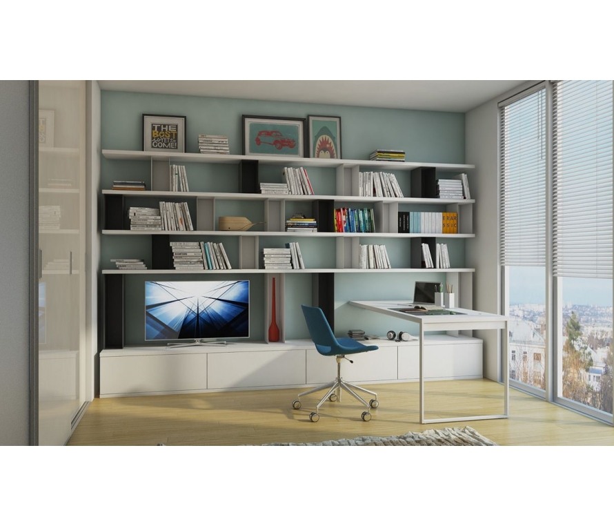Домашний кабинет с панорамными окнами в пол Тем, кто выбирает для себя работу на дому, рано или поздно требуется все больше и больше места. Рационально обустроить домашний мини-офис вам с удовольствием помогут сотрудники наших фирменных салонов. Совсем необязательно выделять для кабинета отдельное помещение, порой достаточно просто небольшой столешницы. Условное деление большого помещения на жилые зоны также имеет свои преимущества: в результате вы получаете все, что необходимо для полноценной работы и отдыха, при этом не теряя полезного пространства. Процесс проектирования мебели требует немало знаний и опыта, поэтому лучше довериться в этом вопросе профессионалам. От вас потребуется план помещения с размерами, мысли и пожелания касаемо цветовой палитры мебельного комплекта, примерного расположения в пространстве, а также перечень того, что нужно разместить в тех или иных модулях. Мир дизайна разнообразен и увлекателен, вам обязательно понравится участвовать в создании дизайн-проекта. Кабинет 039. Компактность, лаконичность и инновационный дизайн Мебельная композиция, представленная на фото, изготовлена в материалах и декорах коллекции «Day System». Подетальное проектирование дает полную свободу действий, поэтому в одном помещении можно разместить рабочую зону, гостиную и предусмотреть функциональный шкаф-купе. Стеллаж, занимающий всю стену, изготовлен из ламинированных плит ДСП в декоре «Алебастр». Между открытыми консольным полками размещены стальные боксы в декорах «Белый» и «Лава», которые выполняют скорее декоративную функцию. Напольные тумбы оснащены выдвижными ящиками полного выдвижения. Вместо ручек внутрь короба установлены фиксаторы системы открывания «Р2О» (Нажал-Открыл). Отсутствие мебельных ручек не только делает композицию изящнее, но еще и исключает возможность удара об них сидящего за столом. Рабочая поверхность размещена таким образом, чтобы на столешницу падал свет из окна.Встроенный в нишу шкаф-купе скрыт за безрамными дверными полотнами «Шифт». Вариант отделки лицевой поверхности – декоративное стекло в декоре «Жемчуг».