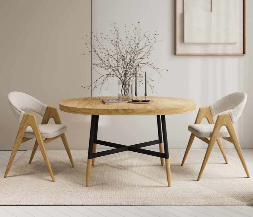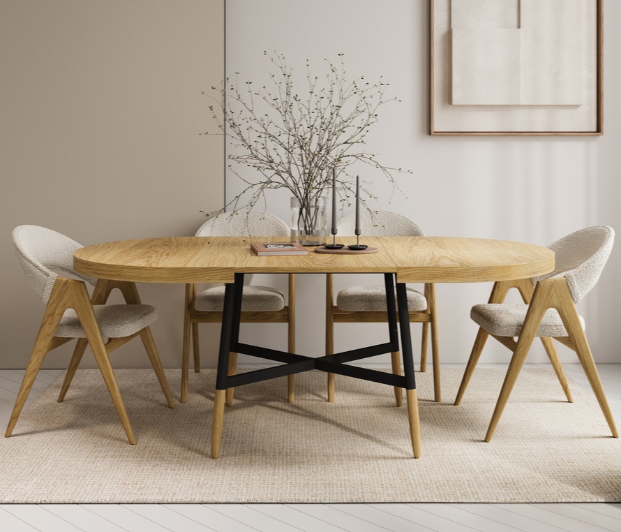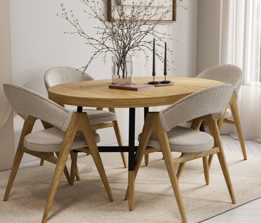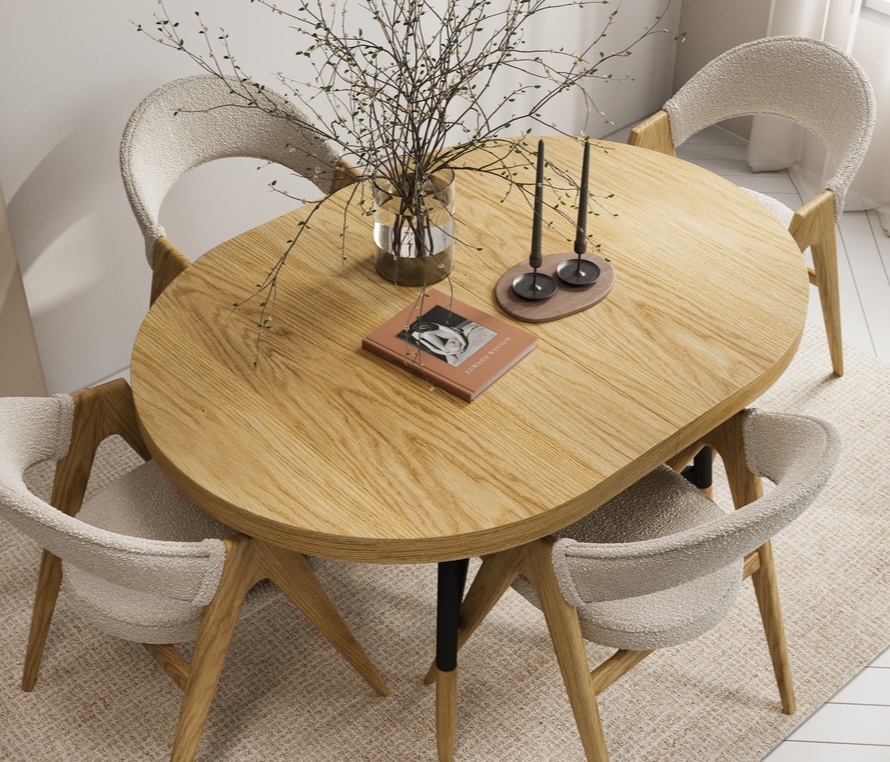 Стол Комби несёт скандинавские нотки и домашнее тепло. Округлые ножки из дерева создают лёгкость, а скошенная кромка столешницы добавляет актуальности. Столешница из шпона дуба или американского ореха выделяет естественную текстуру и насыщенность материала.
