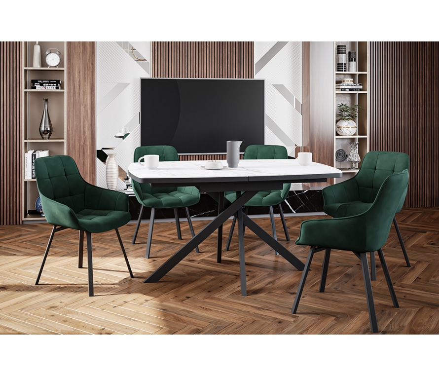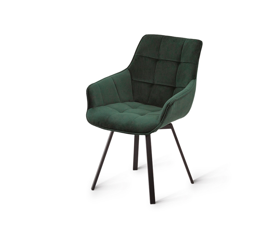 Дизайнерский стул с металлическим каркасом с поворотным сиденьем. Изготовлен в актуальной манере, обивка – люксовый велюр темно-зеленого цвета. Ножки из металлического сплава