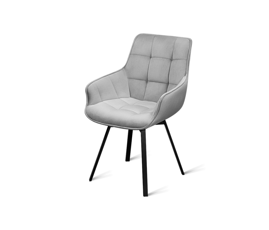 Дизайнерский стул с металлическим каркасом с поворотным сиденьем. Изготовлен в актуальной манере, обивка – люксовый велюр светло-серого цвета. Ножки из металлического сплава в