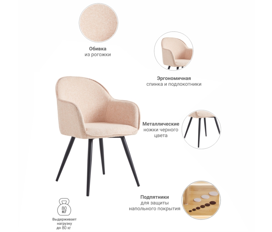 Хотите купить кресло? Не спешите! Стул Frida такой же мягкий и удобный, как кресло и тоже имеет подлокотники. При этом он намного легче, мобильнее и занимает меньше места. Отличительная особенность серии в использовании удобных подлокотников и мягкой рогожки для обивки. Нейтральный бежевый цвет подчеркнет классический интерьер. Сочетание бежевого и черного цветов — это классика, в которой стулья для кухни или гостиной подчеркнут строгость и изысканность интерьера. А металлические ножки будут отлично сочетаться с мебелью с аналогичными ножками или фурнитурой.