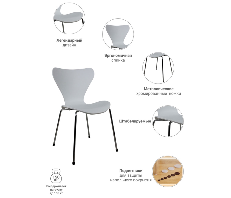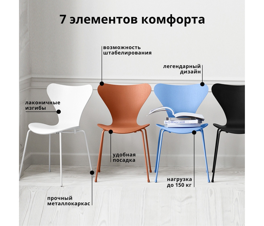 В элегантных и плавных очертаниях стула из серии SEVEN внимательный ценитель сразу узнает одну из самых популярных современных моделей, являющихся истинным эталоном скандинавской простоты и функциональности. Лаконичные изгибы, эргономичность, легкость и компактность – вот, пожалуй, главные отличительные особенности стульев SEVEN. Идеально подходящие для дома, офиса, а также для общественных пространств, стулья SEVEN в мгновение ока штабелируются в одну компактную конструкцию, предоставляя Вам и Вашим гостям простор для истинного полёта фантазии.