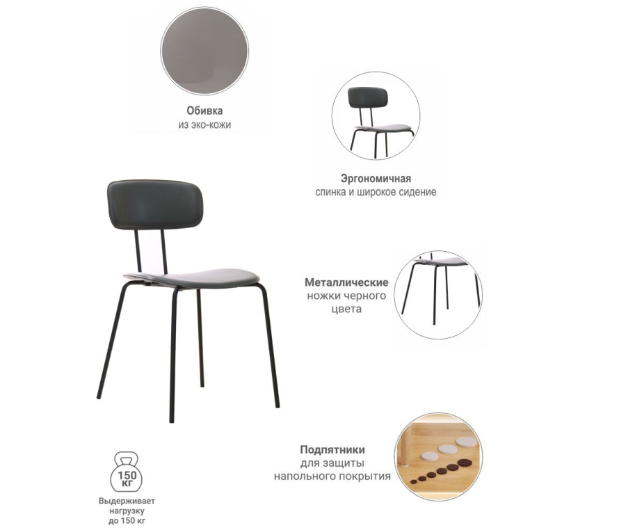 Стильный и лаконичный стул Tokyo на металлическом каркасе. Обивка выполнена из эко-кожи серого цвета. Широкое сиденье и спинка обеспечивает удобную посадку и уют. Такая модель стула прекрасно дополнит интерьер кухни или гостиной, а также кафе, ресторана или бара в стиле Лофт. Конструктивные особенности стула позволяют складывать их в стопки (штабели), что существенно экономит пространство.