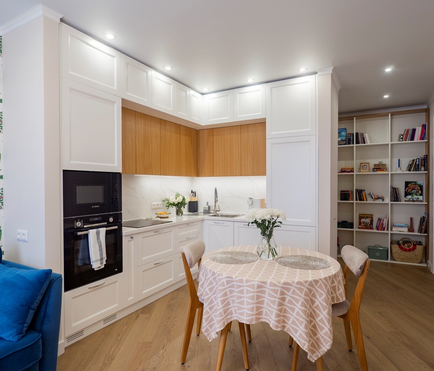 В салоне представлены выставочные образцы кухонь и шкафов, а также образцы материалов.